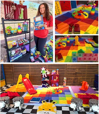 Um espaço seguro e acolhedor para crianças pequenas, com tapete emborrachado, brinquedos educativos e oficinas de pintura, desenho e massinha.