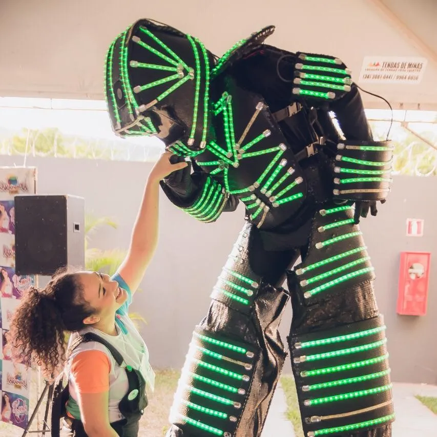 Animadores da Turma do Girafa vestidos com roupas de LED, roupas que brilham de acordo com o ritmo da música, deixando a pista de dança muito mais animada.