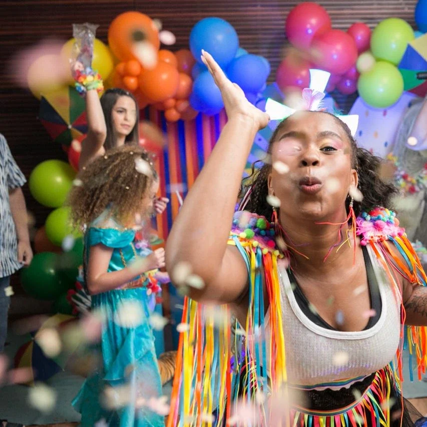 serpentinas e animação para os pequenos curtirem o carnaval com segurança e diversão. Brincadeiras com toda família.